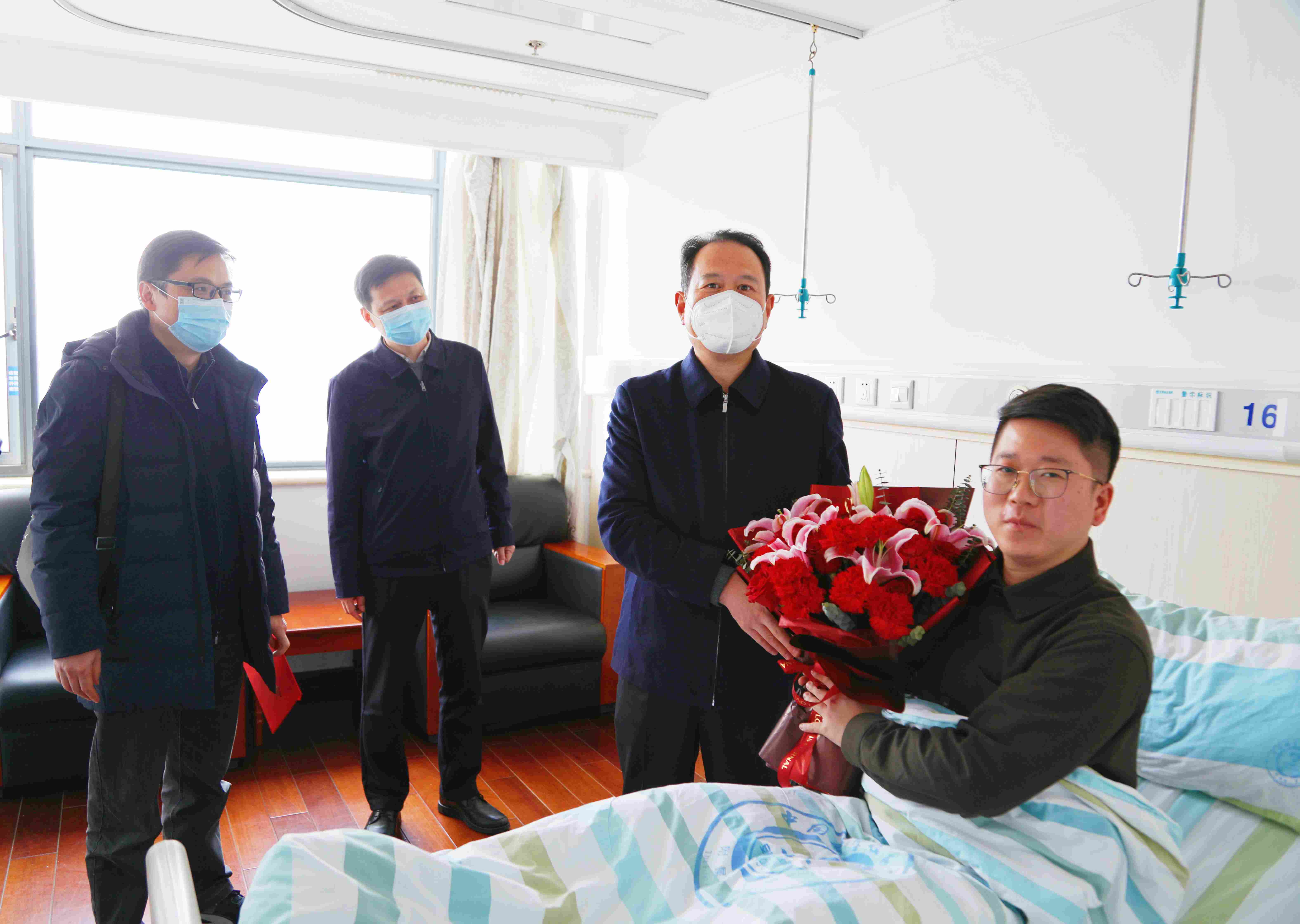 近日,交控集團黨委群眾工作部部長、工會副主席操太林來到省立醫(yī)院,看望慰問交控建工集團職工、造血干細胞捐獻者楊運凱,送去鮮花和慰問品。交控建工集團黨委副書記、總經(jīng)理陳欣,黨委副書記、工會主席朱波參加慰問。